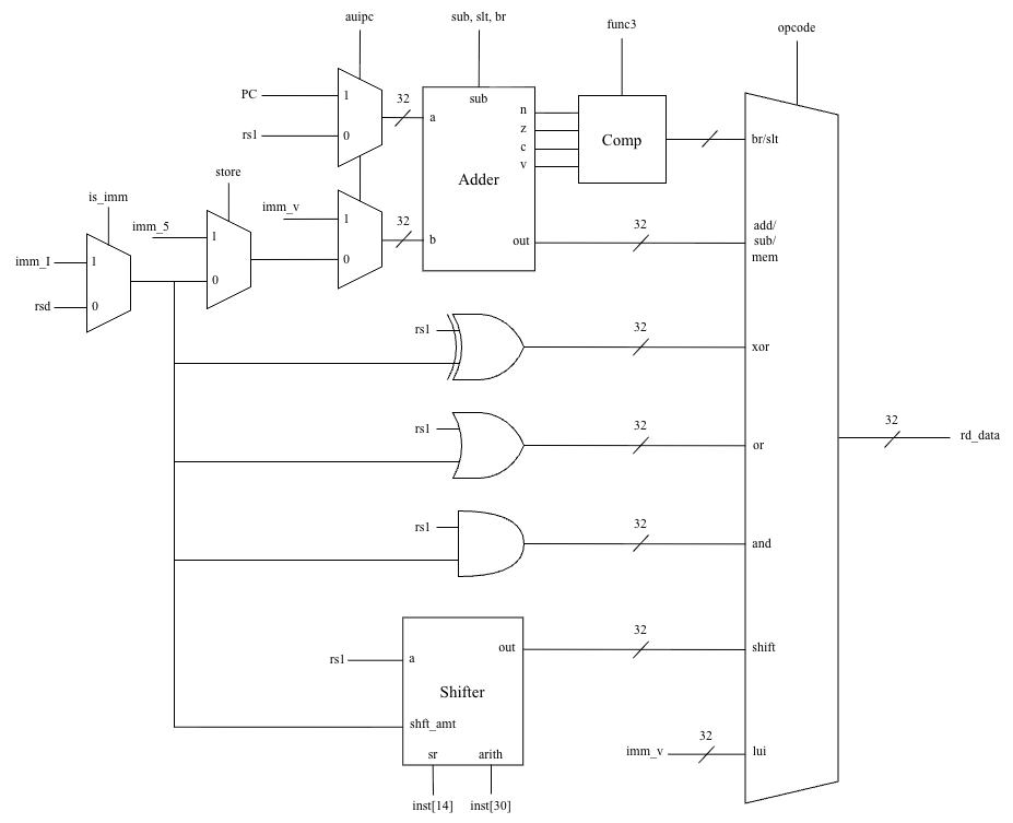 To save area, the ALU uses a few "cheap" hardware tricks. For example, instead of a dedicated comparator, it reuses the ripple-carry adder to perform subtractions for comparisons. It also uses a single barrel shifter for both directions by reversing the operand before and after a right shift.